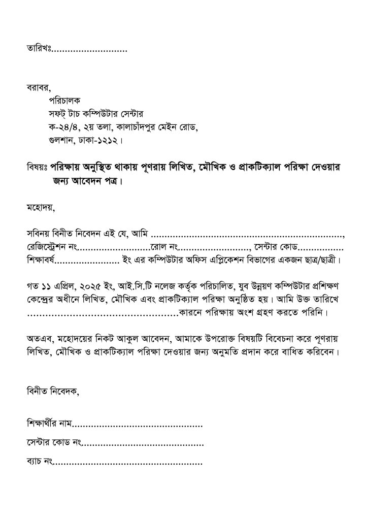যে সকল পরিক্ষার্থী নির্ধারিত সময়ে লিখিত, মৌখিক এবং প্রাকটিক্যাল পরিক্ষায় অংশগ্রহণ করতে পারেনি, সে সকল পরিক্ষার্থী নিজ হাতে নিম্মের দরখাস্তটি লিখবে এবং পরিক্ষার ফি-সহ অফিসে এসে জমা দিবেন। আবেদন পত্রটি জমা দেওয়ার পর পরিক্ষার্থীকে অফিস কর্তৃপক্ষ মেসেস অথবা ফোন কল অথবা স্যোসাল মিডিয়া প্লাটফর্ম এর মাধ্যমে পরিক্ষার দিন ও সময় জানিয়ে দিবেন। নির্ধারিত দিন ও সময়ে পরিক্ষার্থীকে অবশ্যই পরিক্ষায় অংশগ্রহণ করতে হবে, অন্যথায় পরিক্ষার্থীকে অকৃতকার্য এবং তাহার রেজিস্ট্রেশন বাতিল বলিয়া গণ্য হবে। নিম্নের শূণ্যস্থান গুলো অবশ্যই সঠিক এবং নির্ভূলভাবে পূরণ করবেন। কোন প্রকার ঘষামাজা গ্রহণযোগ্য নহে।